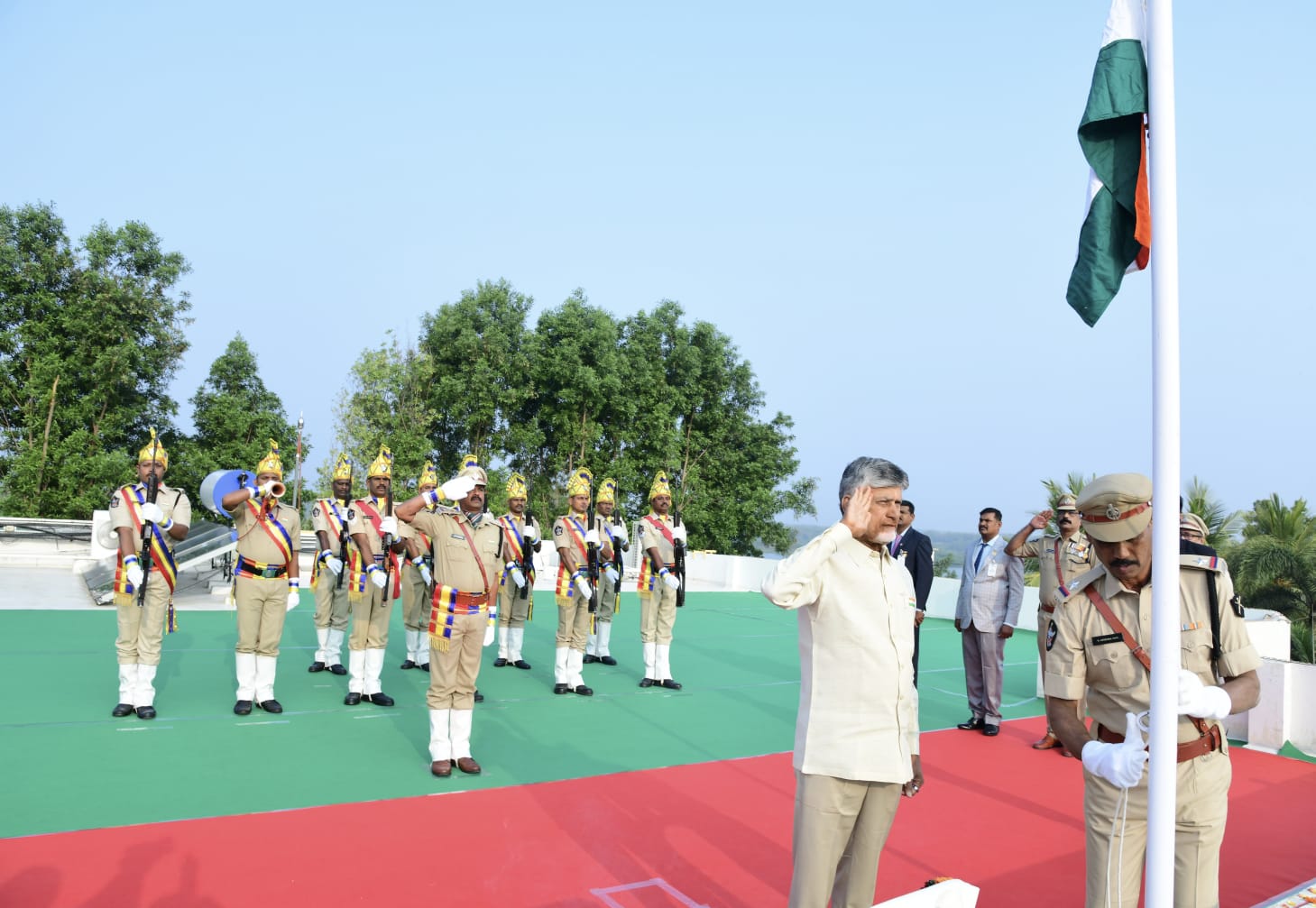 AP CM Chandra Babu unveils tricolor flag at Camp Office