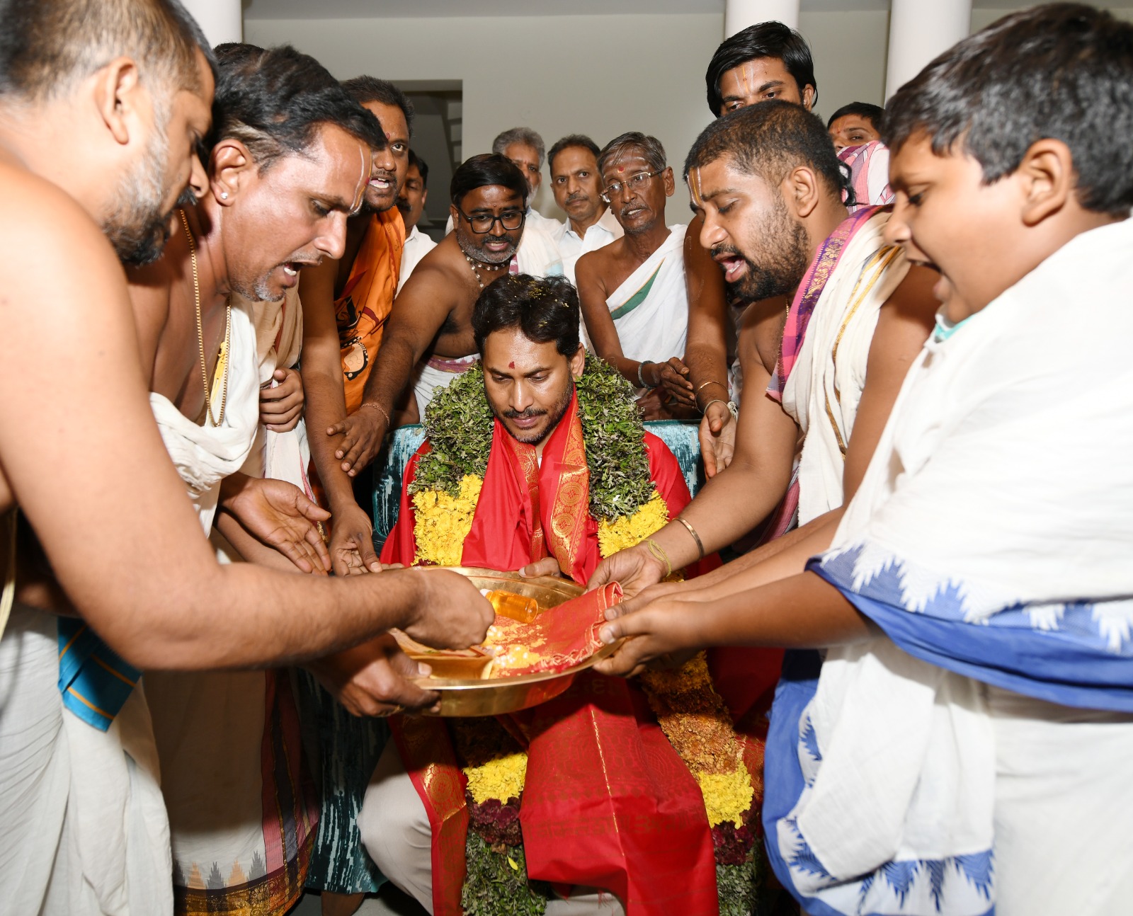 At his residence in Pulivendula, Vedic scholars from the Kodanda Rama temple visited and offered special blessings. They presented sacred offerings, including pearls used in the Sita-Rama Kalyanam ritual and holy prasadam to Jagan.