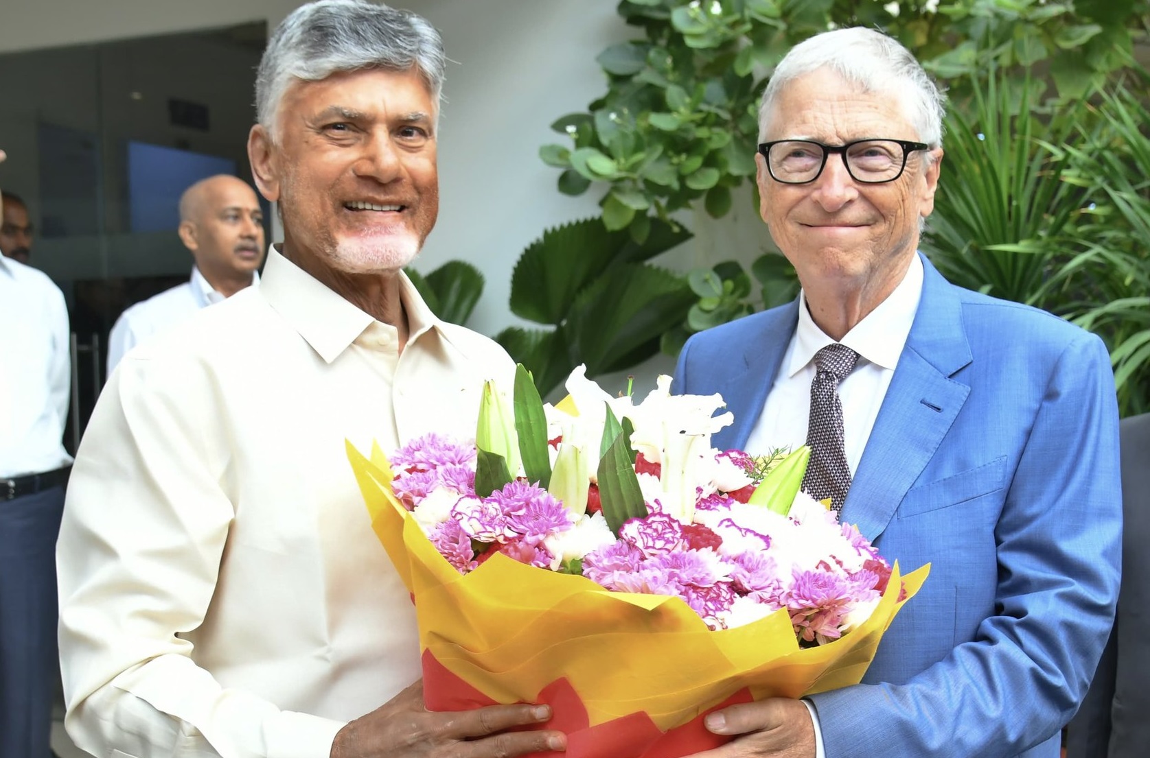 Amaravati, Feb 16: Bill Gates, Founder and Chairman of the Gates Foundation, met Andhra Pradesh Chief Minister Chandrababu Naidu. On Monday morning, after arriving at Gannavaram Airport, Gates went directly to the state secretariat in Amaravati. He was warmly welcomed by CM Chandrababu, Deputy CM Pawan, and several ministers.