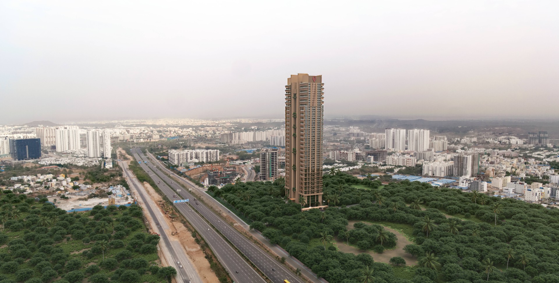 The 52nd floor houses an infinity pool with a view of Gandipet Lake. There is also a world-class spa and multipurpose hall. In most apartments, balcony clothes lines are visible from the outside. Here, since apartments start from the 6th floor, the first five floors are filled with lush greenery—giving residents a refreshing view from every side. The 34th-floor slab is currently completed. About 21 floors remain. The project is moving toward handover by the end of next year