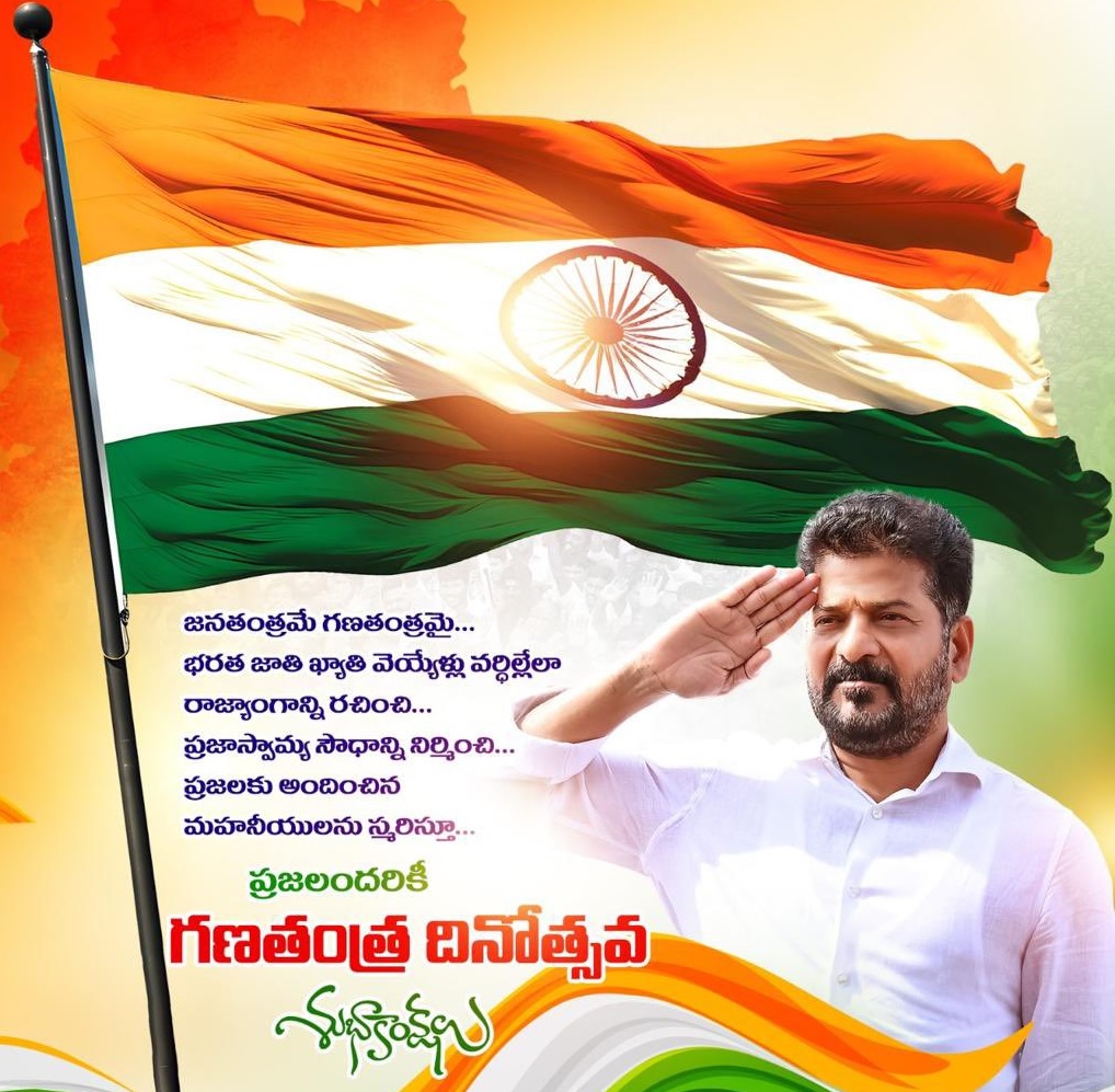 Hyderabad, Jan 26: On the occasion of Republic Day, Chief Minister Shri A. Revanth Reddy extended heartfelt greetings to all the people. Reminding that the Constitution has bestowed freedom along with justice, equality, and dignity to every citizen, he expressed his aspiration for India to surge ahead on the path of progress as a sovereign, socialist, secular, democratic republic.